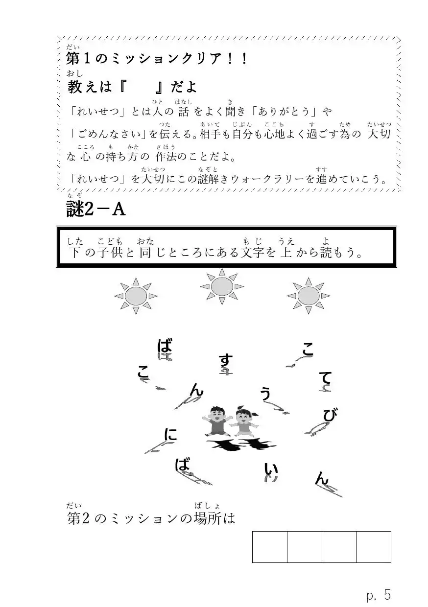 この町には、むかし まちを守る5つの教えをのこした賢者がいた。 ある日、神社のもとに謎の手紙が届く『未来を担うキミたちへ。5つの場所に、まちの教えを託した。全を解き明かし最後の言葉を手にせよ』 町のあちこちに残された「教え」を見つけ出す謎解きウォークラリーが今始まる!